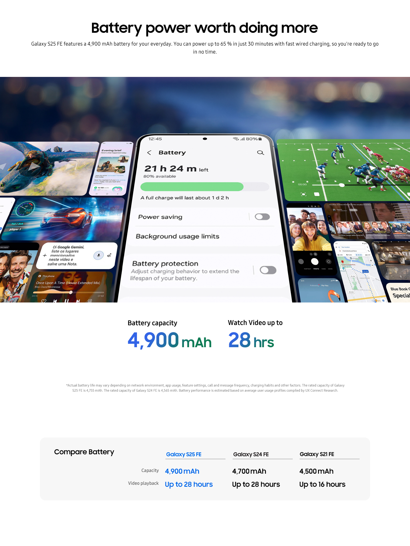 | Rechargeable Lithium Ion 4755mAh(rated) / 4900mAh(typ) Support Type-c wired charging, wireless charging Wireless powershare |