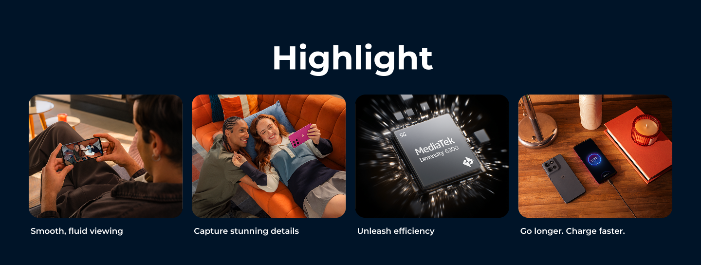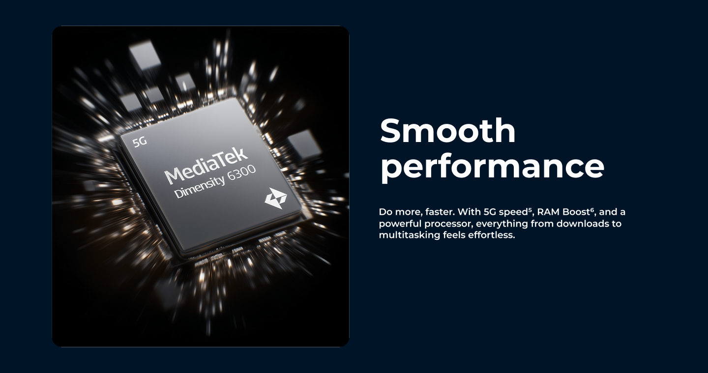 | MediaTek Dimensity 6300 processor with 2.4GHz octa-core CPU and Arm Mali-G57 MC2 GPU |