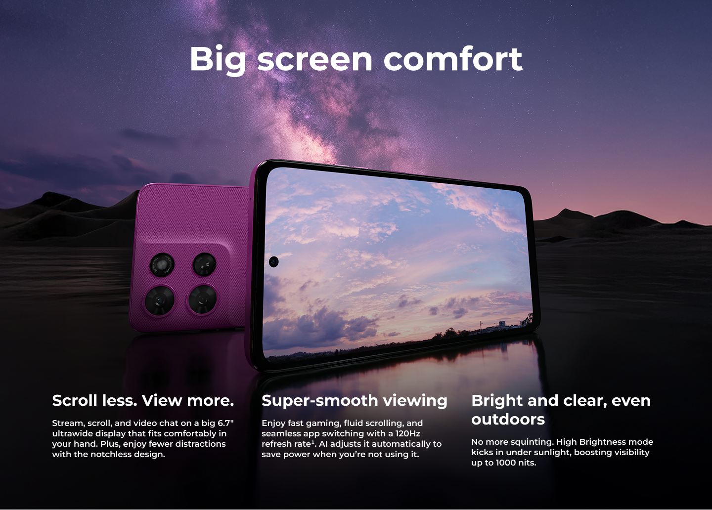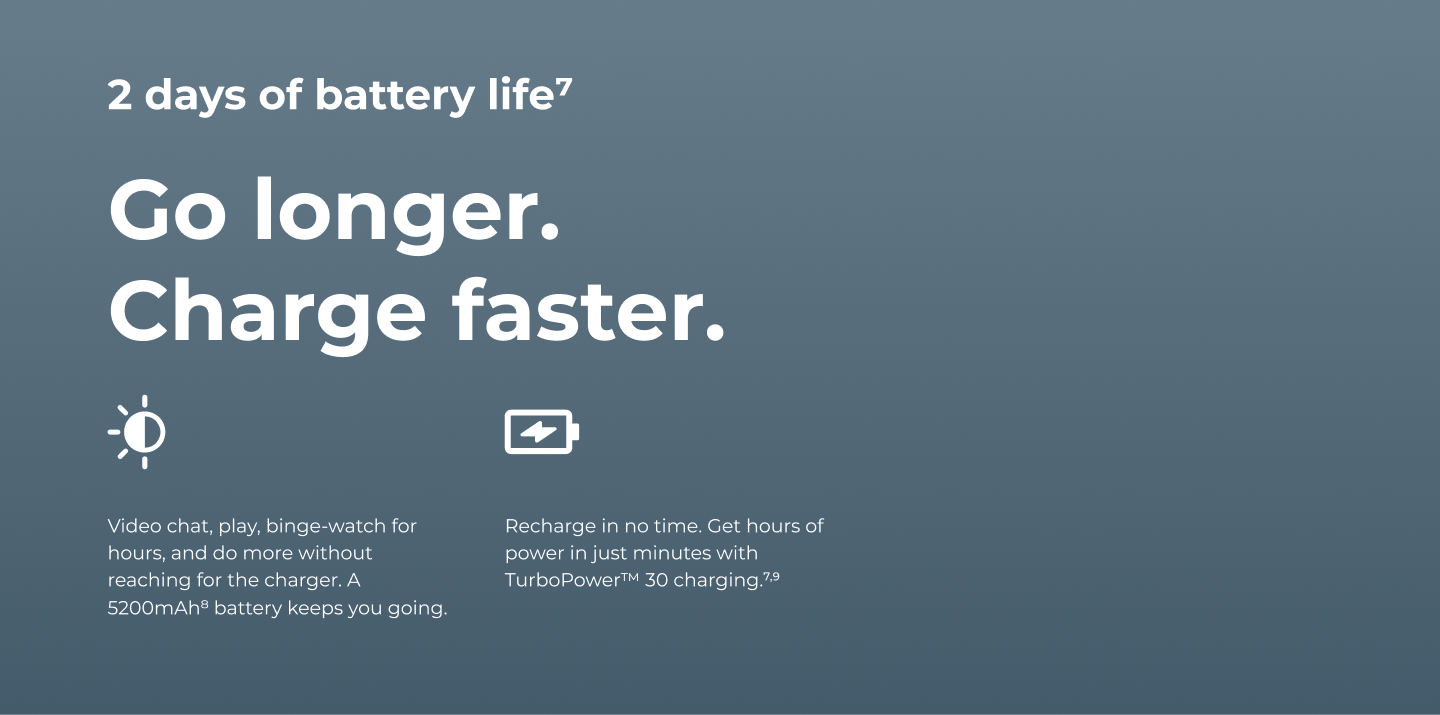 | 6.7″ display HD+ (1604 × 720) | 263ppi resolution LCD| 120Hz refresh rate | Corning® Gorilla® Glass 3 |