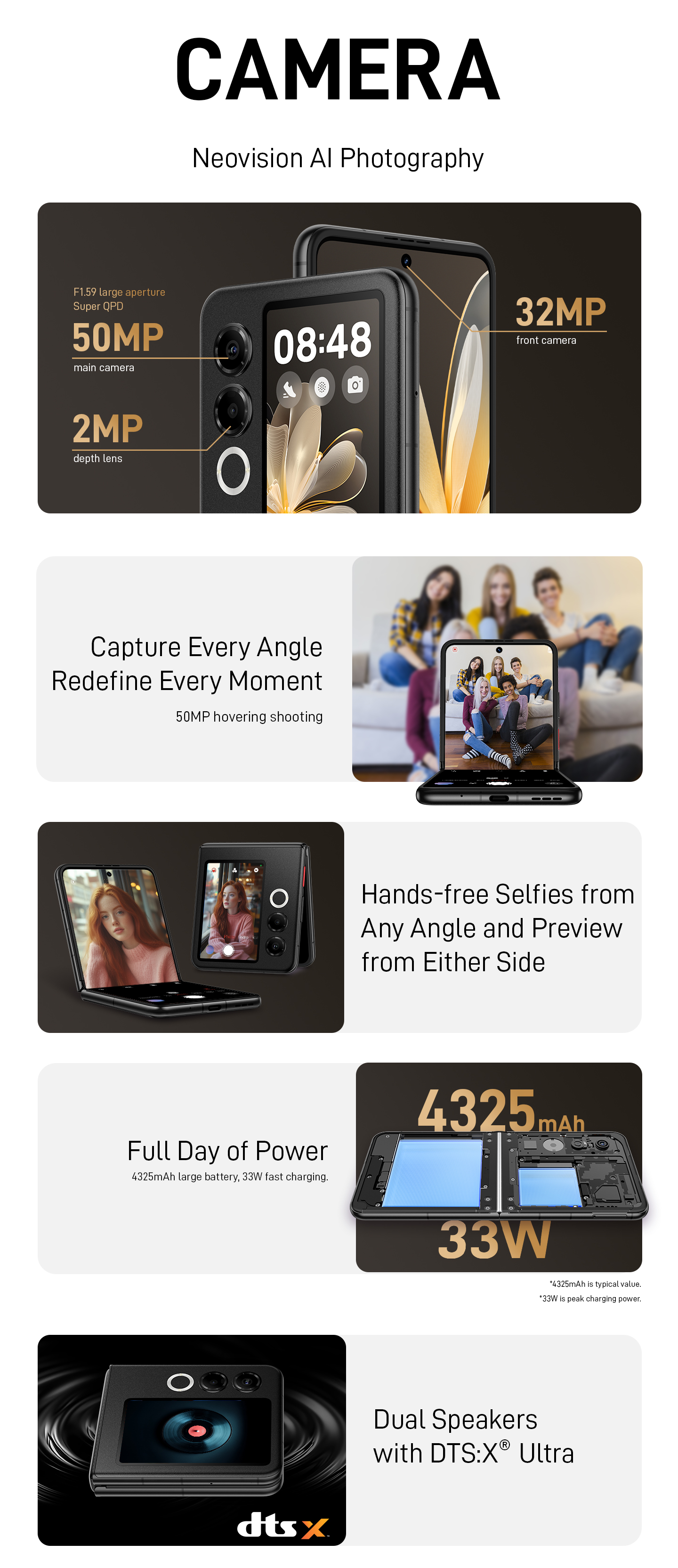 | Front Camera : 32MP,1080P Video Rear Camera : 50MP+2MP, 4K Video |